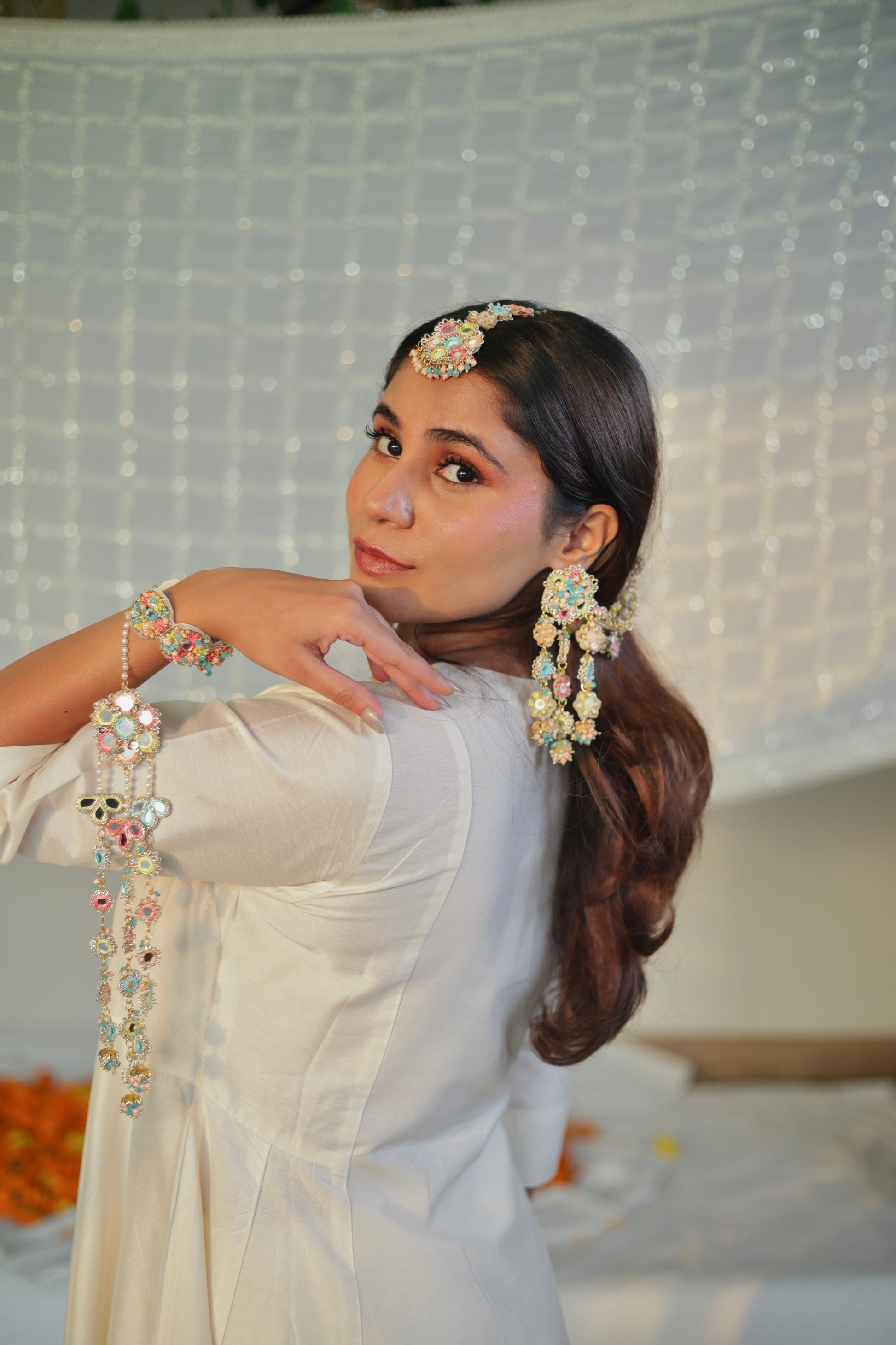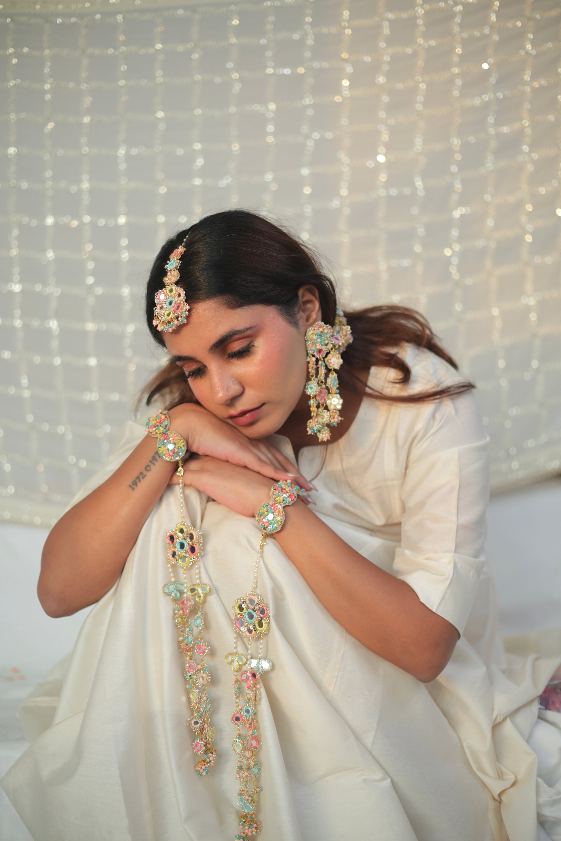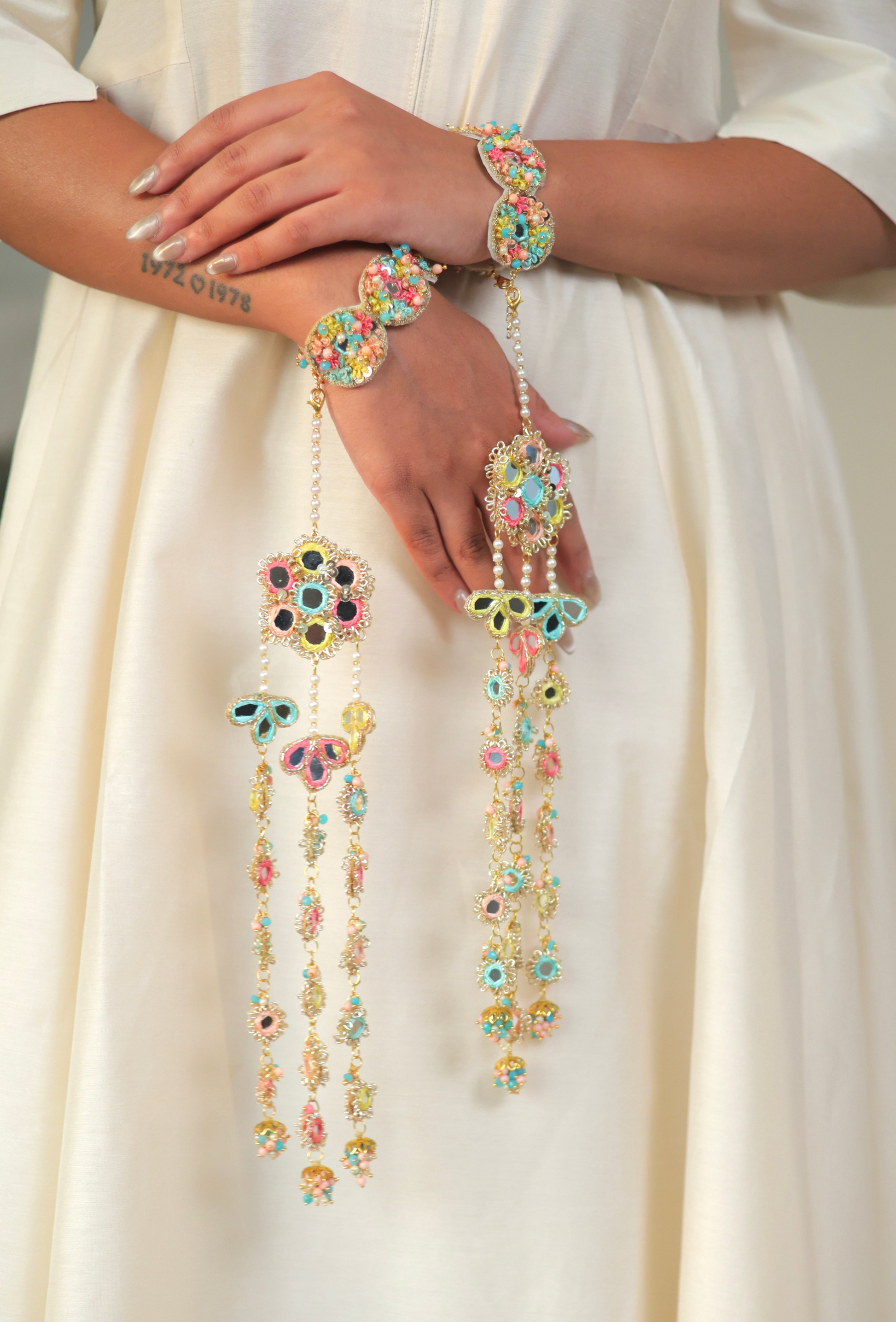 Kaleera comes attached to a beautifully hand-embroidered bracelet crafted with delicate beadwork and threadwork. The soft pastel tones and intricate detailing make it a perfect pick for the bride who loves colour, craft, and culture in equal measure.Wear it as a keepsake of blessings, love, and craftsmanship made thoughtfully, the Mamooli way.